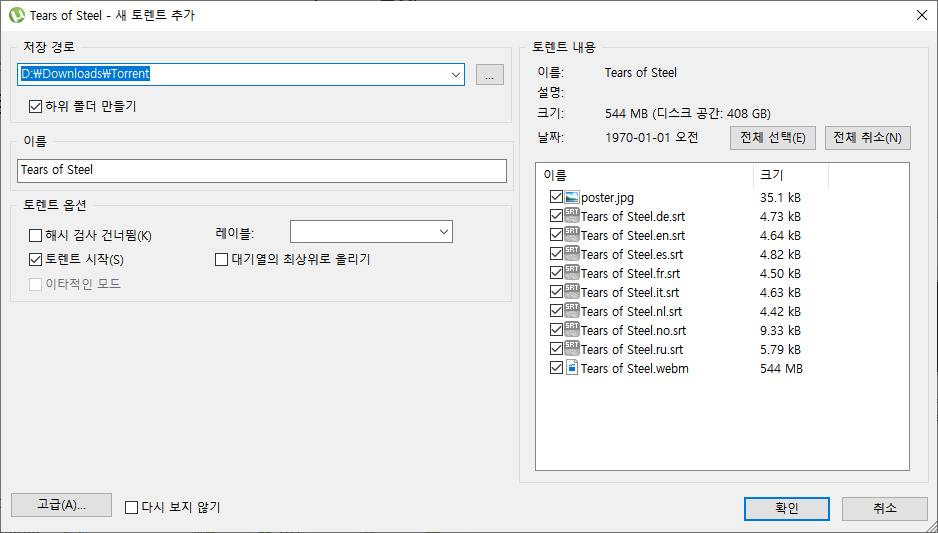 아래 같이 파일의 정보가 뜨면, 양호한 파일이다. 이제 마그넷 다운로드나 토렌트 파일을 다운로드 할 준비가 되었다. 확인을 누르면 된다.